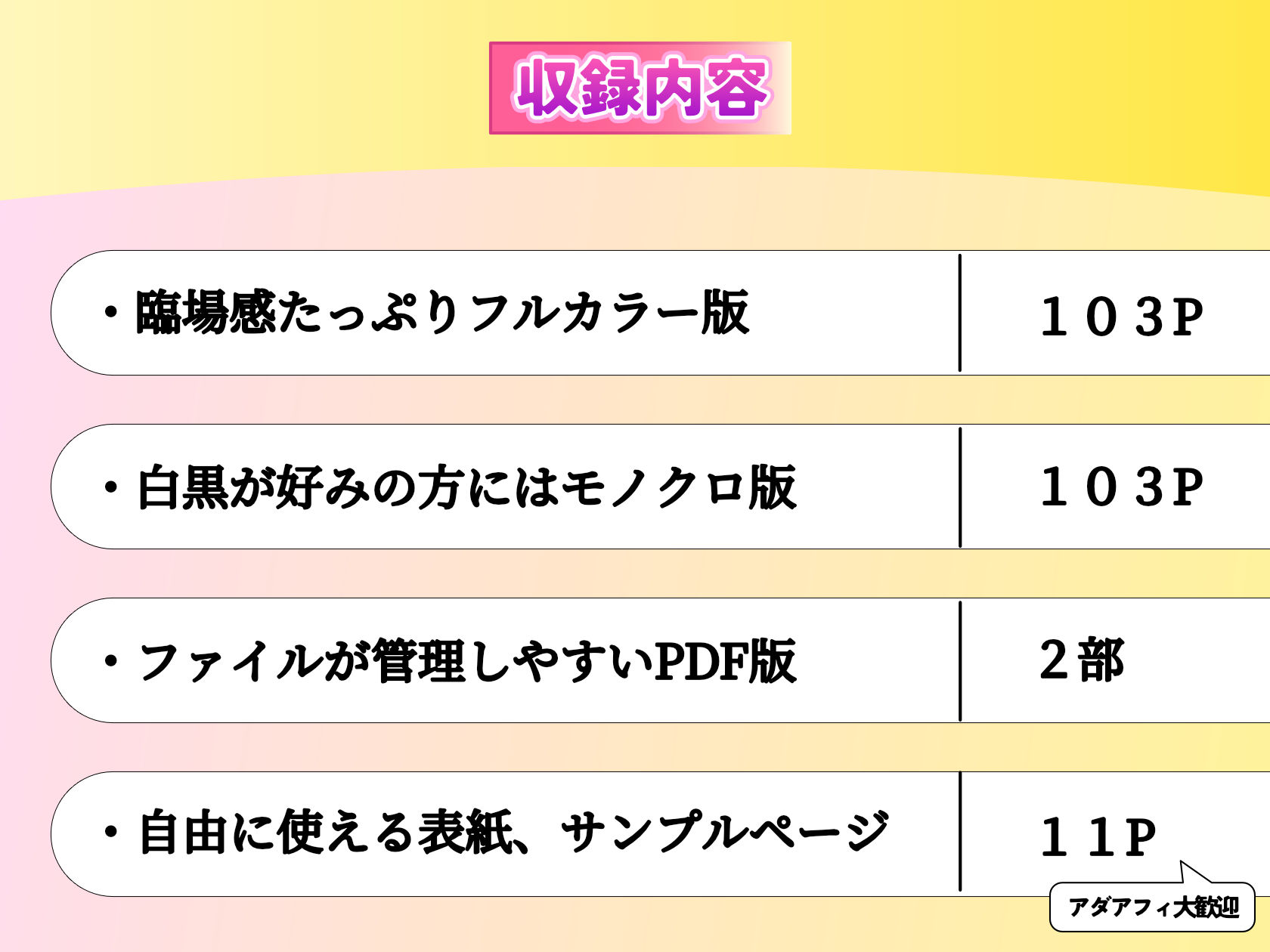 ※場面毎の微妙なニーズの違いに応えるため、各場面の差分をやや多めに収録しています。